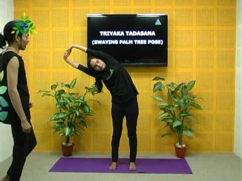 Streamlines the waist and develops balance. Stand with feet 8 inch apart and fix eyes on a point directly in front of you. Interlock fingers and turn palms outward. Inhale deeply as you raise arms over your head. As you breathe out, bend from your waist to your left side, taking care not to reach forwards or backwards. Hold for a few seconds, then inhale deeply and slowly return to the upright position.